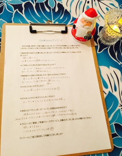 ブログをご覧頂きまして有難うございます^^ ロミロミサロンOla☀Alohaの佐久間です! アットホームなサロンをお探しの方 静かな空間で施術を受けたい方 自分だけの空間でリラックス感を味わいたい方 Ola☀Alohaならその要望お答え致します♡ 最近頂きました感想をご紹介致します↓ Q 施術を受ける前に悩んでいたことは? A 腰が痛かった。仕事でストレスや疲労が溜まっていた。 Q 予約の決め手は? A HPを見てハワイアンで可愛かった。またロミロミに興味があった。 Q 施術後の変化、良かった点は? A 色々な香りを楽しめるのでとてもリラックスできた 気になっていた体の部分も軽くなった Q セラピストはいかがでしたか? A とても優しい方でリラックスできます Q どんな人にサロンを進めたいですか? A ロミロミやリラックスを求めているお友達 Q 他店と比べていい点、リピートしている理由はありますか? A 他店のエステサロンは殆ど行ったことがないですが、こちらはアットホームでこじんまりしているので。 賑やかな所が苦手なので。 嬉しいご感想有難うございました♡ 施術を受ける時の物音や他の人の話し声で、リラックスしきれなかったことありませんか? 個人サロンの良さは“自分だけの空間”ということです! 自分だけしかいないからこそ! 周りを気にせず話したいことが話せたり、 静かな空間で施術が受けられるんです♡ 忙しく時間に追われたり上司や周りの人間関係で疲れてるからこそ、…